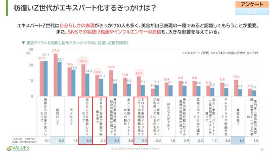 美容アイテムを利用し始めたきっかけについて尋ねると、「エキスパートZ世代」は20%超が「自分らしさを表現したくなって」と回答しており、美容が自己表現の1つの手段であると認識してもらうことが、潜在層をエキスパート化する上で重要であると考えられます。また、「SNSで垢抜け動画や画像を見て」「SNSで美容インフルエンサーの発信情報を見て」といった項目も「エキスパートZ世代」で高くなっており、SNS上の情報が意思決定に大きな影響を与えていることがうかがえます。