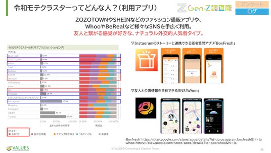 クラスターごとの行動実態としては、支出先の他、対象者のオンライン行動データを用いてSNSやショッピング系でよく使われているアプリも集計しています。例えば「令和モテクラスター」では、Instagramのストーリーと連携できる匿名質問アプリ「BoxFresh」などの利用が特徴的です。