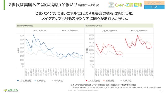 すると、Z世代男性は上の世代よりも検索数が多く、美容関連の情報収集が盛んであることがわかりました。また、メイクアップよりもスキンケアに関心がある男性が多いことが見て取れます。
