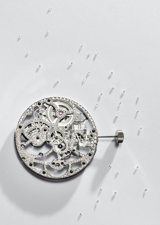 「時計とは何よりもまずジュエリーなのです。」イヴ・ピアジェは、1874年にスイスのラ・コート・オ・フェで誕生したピアジェの歴史とそのパラドックスをこの一言で端的に表現しました。何もよりもまずウォッチ職人であり、薄型の専門家でもあるメゾンの職人たちは、1960年代の初めに、アイコニックな9P自社製ムーブメントのリズムに調和する色鮮やかなオーナメンタルストーンを使用し、これらの洗練されたウォッチに美的要素を取り入れました。それは、才能ある職人たちがクチュールの魅力をジュエリーに表現するための新たな創作の場となりました。2つの世界が自由に交差し、メゾンのスケルトンの構造的なラインもまた、まばゆい宝石のシャワーで彩られています。細部にまでこだわり、角やわずかな曲線に至るまで宝石をあしらうことで、ゴールド製の1200D自社製自動巻ムーブメントは近年1201D1へと改良されました。