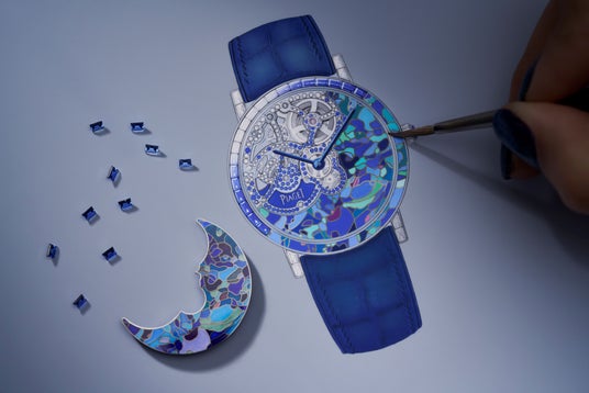 ピアジェの最高を生み出すアトリエが、宝石をあしらったスケルトンムーブメントやメティエ・ダールの技術における可能性を常に探求し続け、この二つの技術を融合する時がやってきました。150年以上にわたりピアジェの職人たちをインスパイアし続けている、「常に必要以上に良いものをつくる」というジョルジュ=エドワール・ピアジェのモットーに忠実に、ダイヤモンドとブルーサファイアで彩られた貴重なスケルトンを、2006年以来メゾンが信頼を置くパートナーである、名高いエナメル職人アニタ・ポルシェに委ねました。