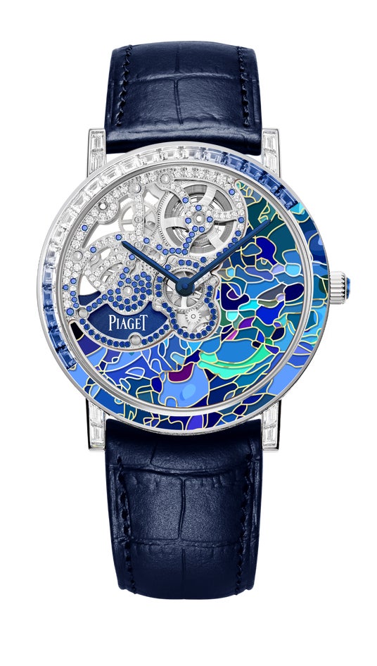 極めて稀少なアイテムであるアルティプラノハイジュエリーは、ダイヤモンドとサファイアがあしらわれたアイコニックなスケルトンムーブメントに、「グラン・フー」クロワゾネエナメルが新たな魅力を添えています。ピアジェの最高を生み出すアトリエと、エナメル職人アニタ・ポルシェのダブルサインが刻まれた、8本限定のクリエイション。