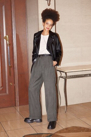 立体感のある設計で、ウエストまわりをすっきり見せるワイドパンツ。