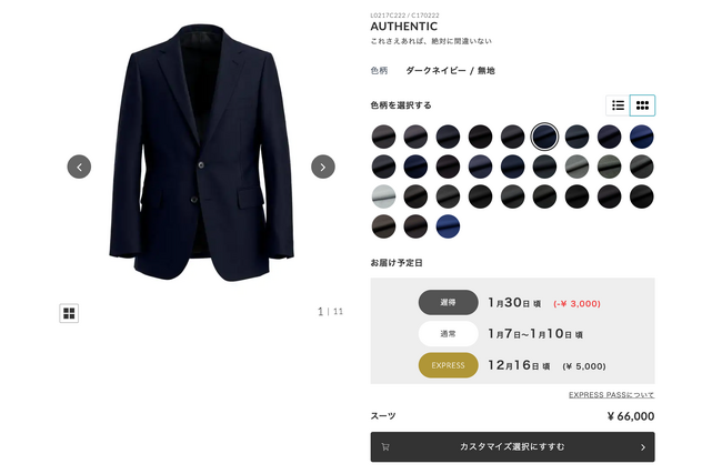 「遅得」でオーダースーツをご注文いただいた場合、割引が適用されます。割引価格は受注数や納期に応じて変動する、ダイナミックプライシングの手法を取り入れました。