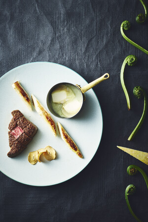 厳選黒毛和牛サーロイン120g または 厳選黒毛和牛フィレ100g(追加料金1,650円)ホワイトアスパラガスのバターローストとつやこフロマージュ