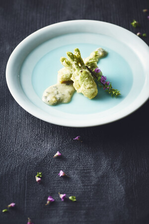 春の王道といえばタラの芽。ほんのり苦く甘味がつづく、ホクホクした食感のタラの芽の天麩羅は、ブルーチーズの塩味とコクが天麩羅とマッチして絶妙なバランスに。