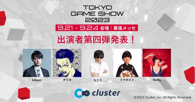 イベント累計動員数2,000万人を超える、国内最大級のメタバースプラットフォーム「cluster」を運営するクラスター株式会社(本社:東京都品川区、代表取締役CEO:加藤直人、以下「クラスター」)は、2023年9月23日(土)・24日(日)に開催される東京ゲームショウ2023一般デーにて、人気ストリーマーの「k4sen」さん、「ボドカ」さん、「もこう」さん、「トナカイト」さん、タレントの「RaMu」さんのステージコンテンツへの出演が決定しました。当日は、会場にて抽選で選ばれた一般参加者とストリーマーが対戦するメタバースゲーム「鬼GOKKO」などにも挑戦していただきます。