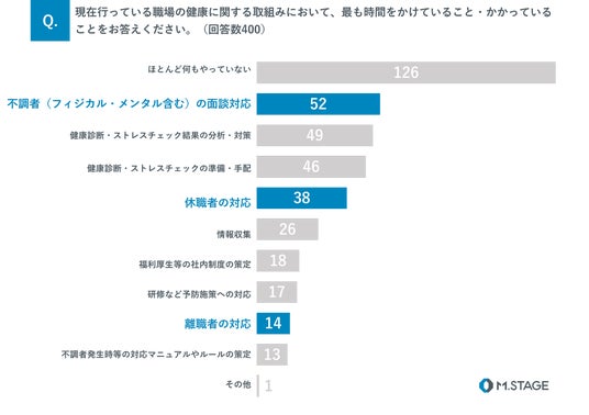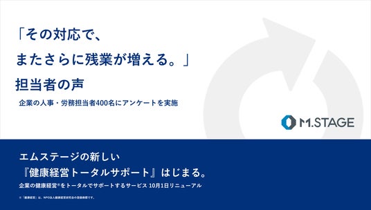 事業場向け産業保健支援、医療人材総合サービスを提供する株式会社エムステージ(東京都品川区、代表取締役:杉田雄二)は、企業の健康への取り組みを総合的にサポートするサービス『健康経営トータルサポート』のリニューアルに伴い、企業の人事・労務担当者400名に「職場の健康に関する取組み」についてアンケートを実施しました。