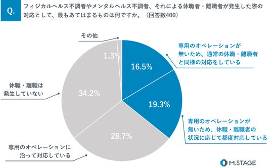 フィジカルヘルス不調者やメンタルヘルス不調者、それによる休職者・離職者が発生した際の対応について、35.8%の担当者は「専用のオペレーションが無い」と回答。反対に「専用のオペレーションがある」という回答は28.7%となり、無いという回答を下回る結果となりました。