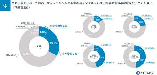 コロナ前と昨年度(2023年4月~2024年3月)を比較した際のフィジカルヘルス(身体的)不調者やメンタルヘルス不調者の増減の程度について、「かなり増加した」と回答した担当者は8.0%、「やや増加した」と回答した担当者は24.5%となりました。3割以上が増加を感じる結果となりました。