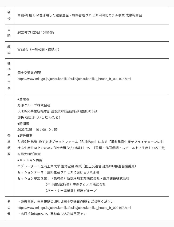 建設DXに取り組む野原グループ株式会社(本社:東京都新宿区、代表取締役社長:野原弘輔)は、2023年7月25日10時からWEB会議形式で開催される、国土交通省主催「令和4年度 BIMを活用した建築生産・維持管理プロセス円滑化モデル事業 成果報告会」に、次の通り、報告事業者として参加します。