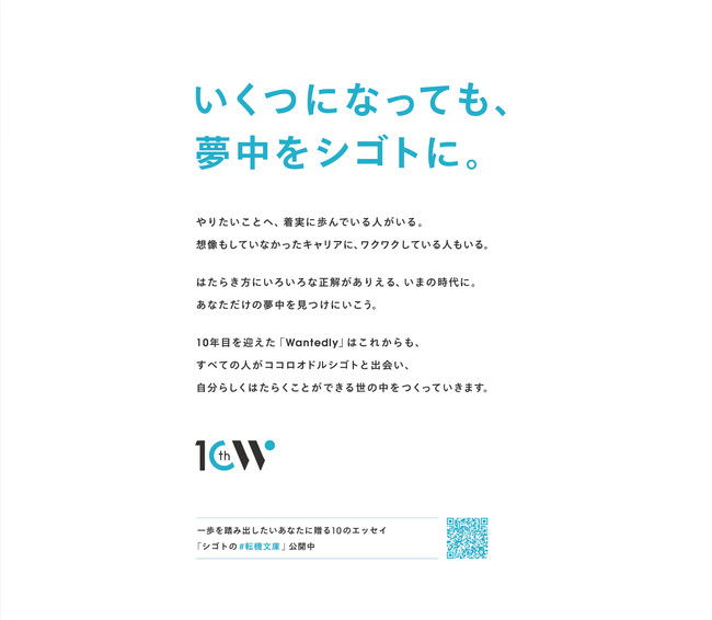 ウォンテッドリーは、企業の潜在転職者への認知形成、共感を軸とした人と企業の出会いの創出を提供しながら、入社後の従業員の定着、活躍を支援するエンゲージメント事業を推進しています。今回のWantedlyの10周年を契機とした取り組みを通じて、Wantedlyが「はたらくすべての人のインフラ」となる世界の実現を加速させてまいります。