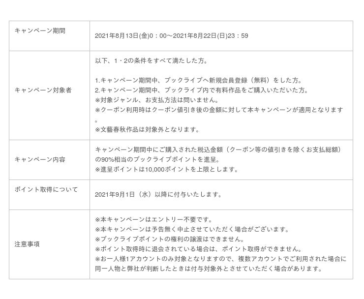 凸版印刷株式会社のグループ会社である、株式会社BookLive(本社:東京都港区・代表取締役社長:淡野 正・以下、当社)が運営する総合電子書籍ストア「ブックライブ」は、「夏得キャンペーン」と題し、8月13日より、期間中の新規会員登録で最大10,000ptを上限に購入金額の90%が還元されるポイントバックキャンペーンを実施します。