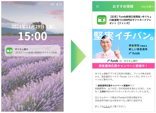 固定利回り投資の資産運用サービス「Funds(ファンズ)」を運営するファンズ株式会社(本社:東京都渋谷区、代表取締役CEO:藤田雄一郎、以下 当社)は、本日11月29日より、株式会社ゆうちょ銀行(本社:東京都千代田区、取締役兼代表執行役社長:笠間 貴之、以下 ゆうちょ銀行)のデジタルサービスにおける「共創プラットフォーム」のパートナー企業として、ゆうちょ通帳アプリ等を通じた広告配信での連携を開始したことをお知らせいたします。
