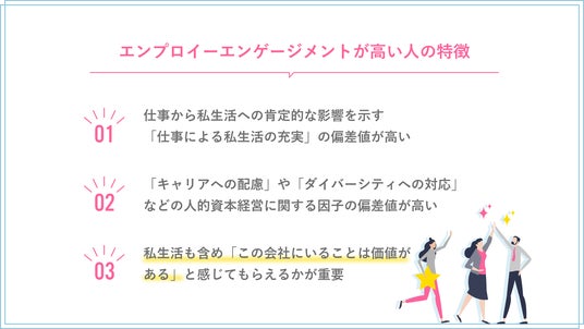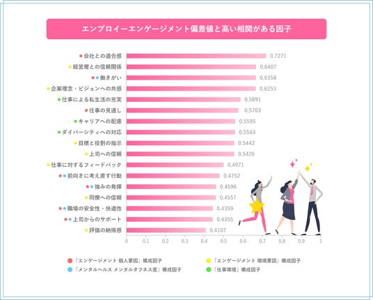 さらに、仕事から私生活への肯定的な影響を示す「仕事による私生活の充実」(同0.59)や、「キャリアへの配慮」(同0.56)「ダイバーシティへの対応」(同0.56)、といった従業員を取り巻く仕事環境・会社の姿勢に関連する因子も上位に挙がる。