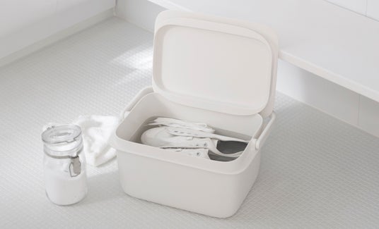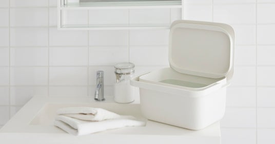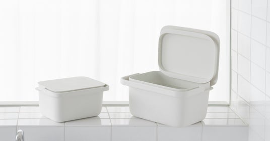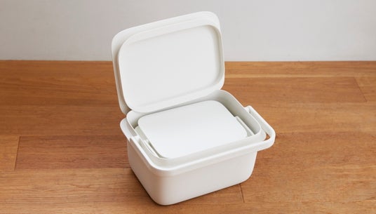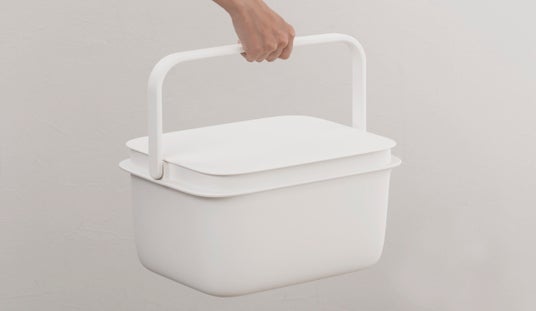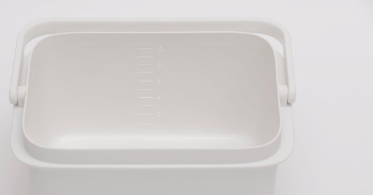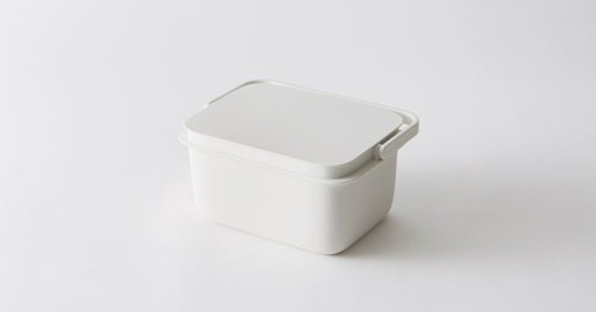 2020年1月に発売した「バケツ 5L」は、浸け置き洗いや掃除などの使いやすさにこだわり、スクエア型でフタ付きにしました。容量は約5Lとコンパクトで洗面台でも注水しやすいかたちです。浸け置き時はフタをかぶせることで中身が隠せておけて、お子様やペットのいるご家庭も安心です。フタは本体のフチに立てかけられます。目盛り(1L毎)が付いており、洗剤を希釈する際に水の量がひと目でわかります。ハンドルは幅広で手当りが良く、持ち運びしやすくしました。置いていてもすっきりとした佇まいで、フタ付きの収納としてもご活用いただけます。また、「時代に即した良品」と評価いただき、2020年度のグッドデザイン賞を受賞しています。