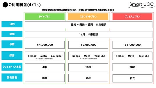 広告出稿とセットでUGC風クリエイティブの制作・配信を行う定額制パッケージであり、目的や媒体、配信ボリュームに応じて、以下の3つのプランから選択いただけます。