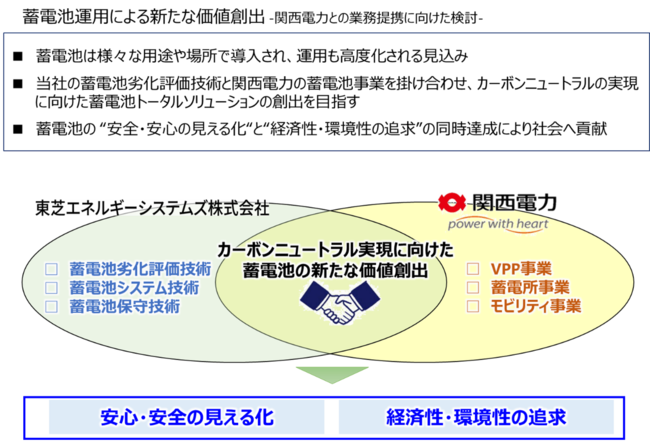 今回、業務提携に向けて、当社の蓄電池劣化診断技術の知見を関西電力の関係する蓄電所をはじめとする蓄電池事業に取り入れていただき、アセットマネジメントの高度化や効率化を図ります。また、当社はその知見を通じ、同社が蓄電池事業で培ったノウハウとの融合による蓄電池の保守運用サービス等の創出や、車載用・定置用蓄電池のリユース事業の展開に貢献します。