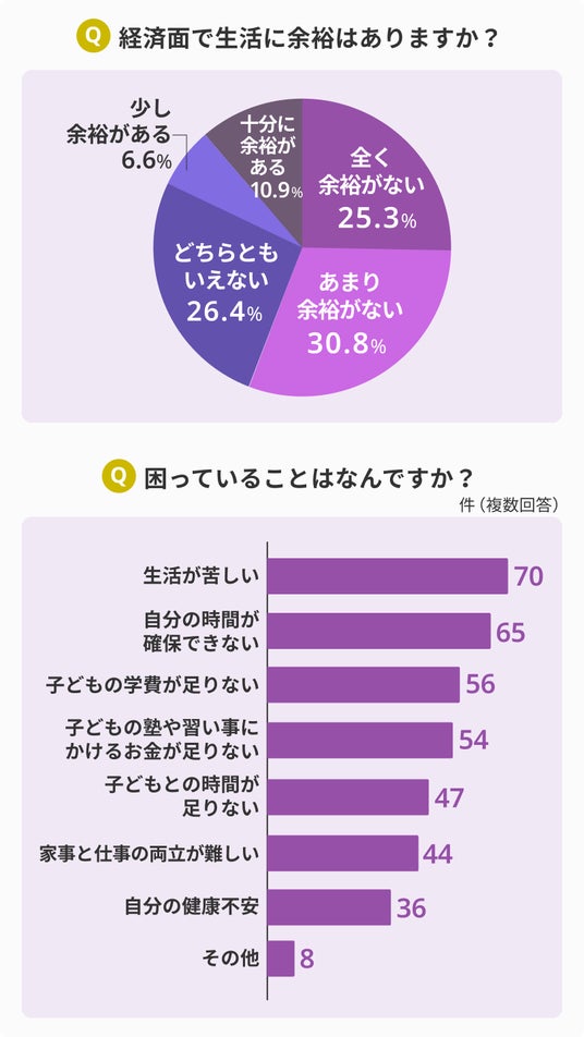 一方で、働きながら子どもを育てなければいけない家庭の場合、「自分の時間が確保できない」、「家事と仕事の両立が難しい」といった悩みを抱える方も一定数いることがわかりました。