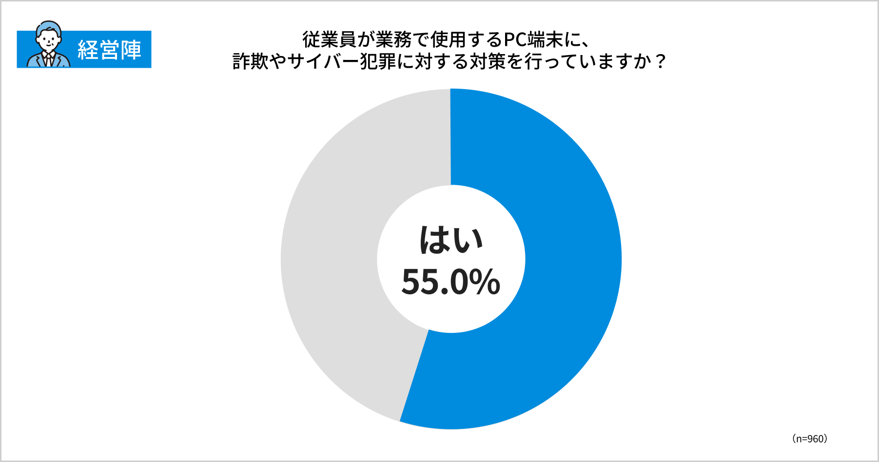 企業の経営陣に「従業員が業務で使用するPCに、詐欺やサイバー犯罪に対する対策を行っていますか」を尋ねたところ、全体の55%が「はい」と回答しました。
