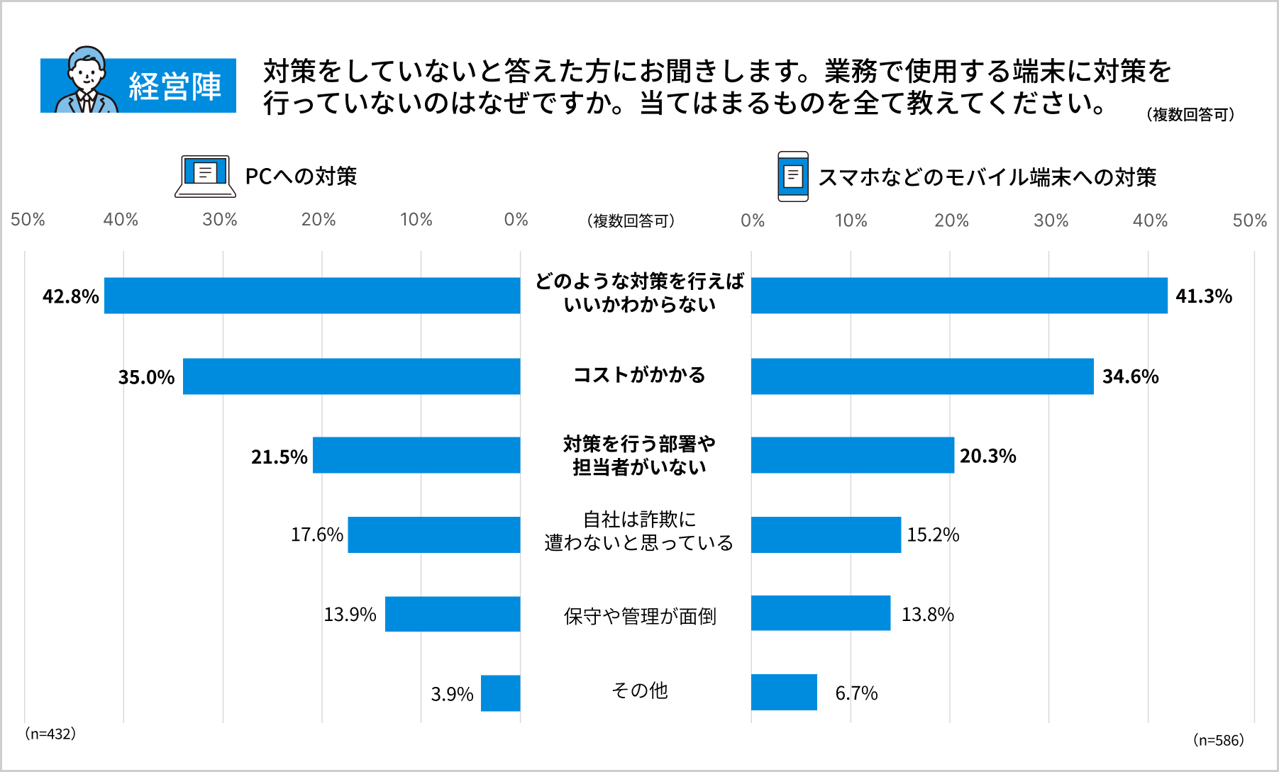スマホなどのモバイル端末に対する対策はさらに手薄で、自社で対策を行っていると答えた経営陣は39%にとどまりました。
