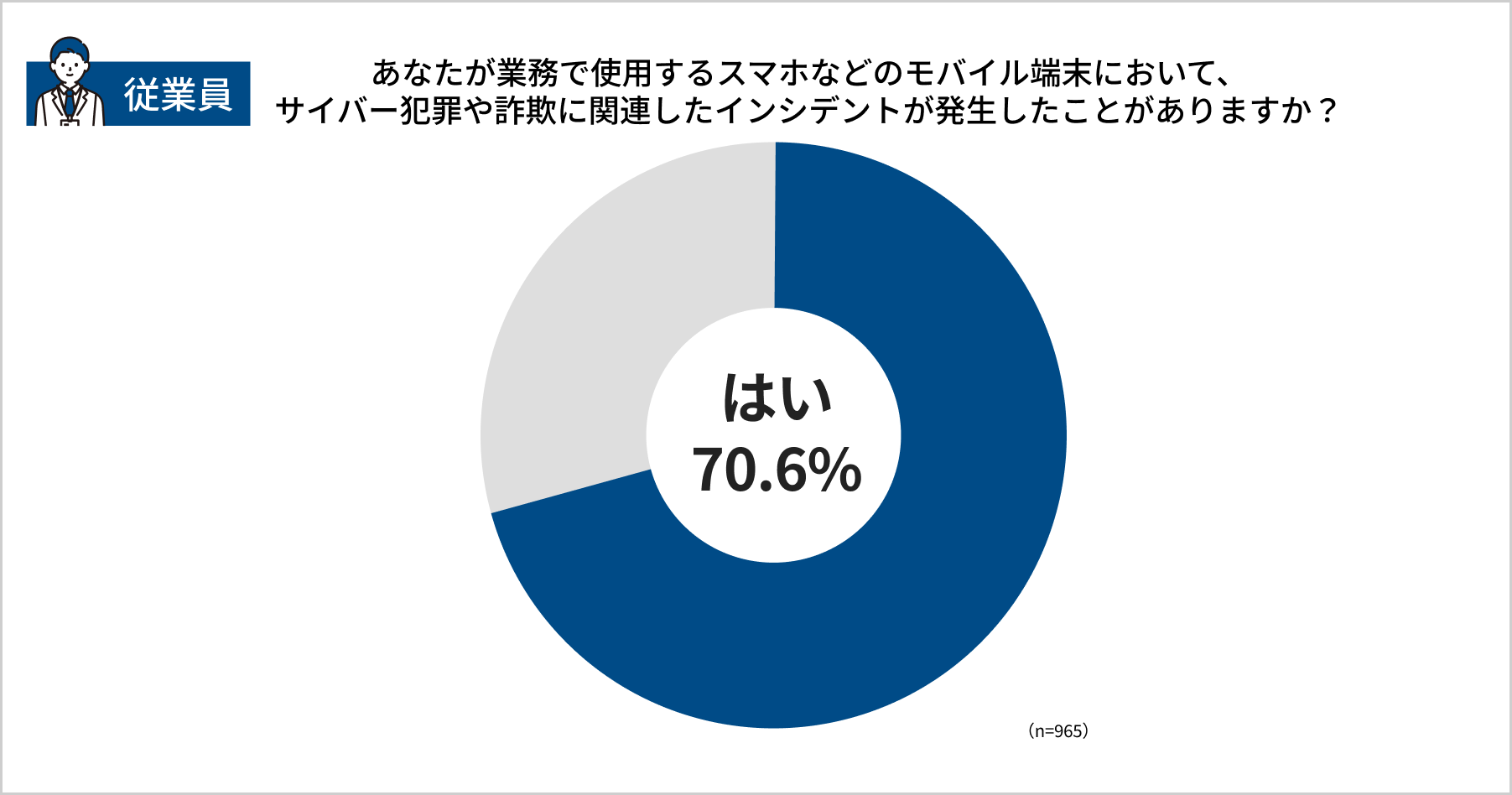 企業の経営陣に「自社においてサイバー犯罪や詐欺に関連したインシデント(注1)が発生したことがありますか」と尋ねたところ、77.3%が「インシデント経験あり」と回答しました。同様の質問を従業員に行ったところ、70.6%が「インシデント経験あり」と回答しました。