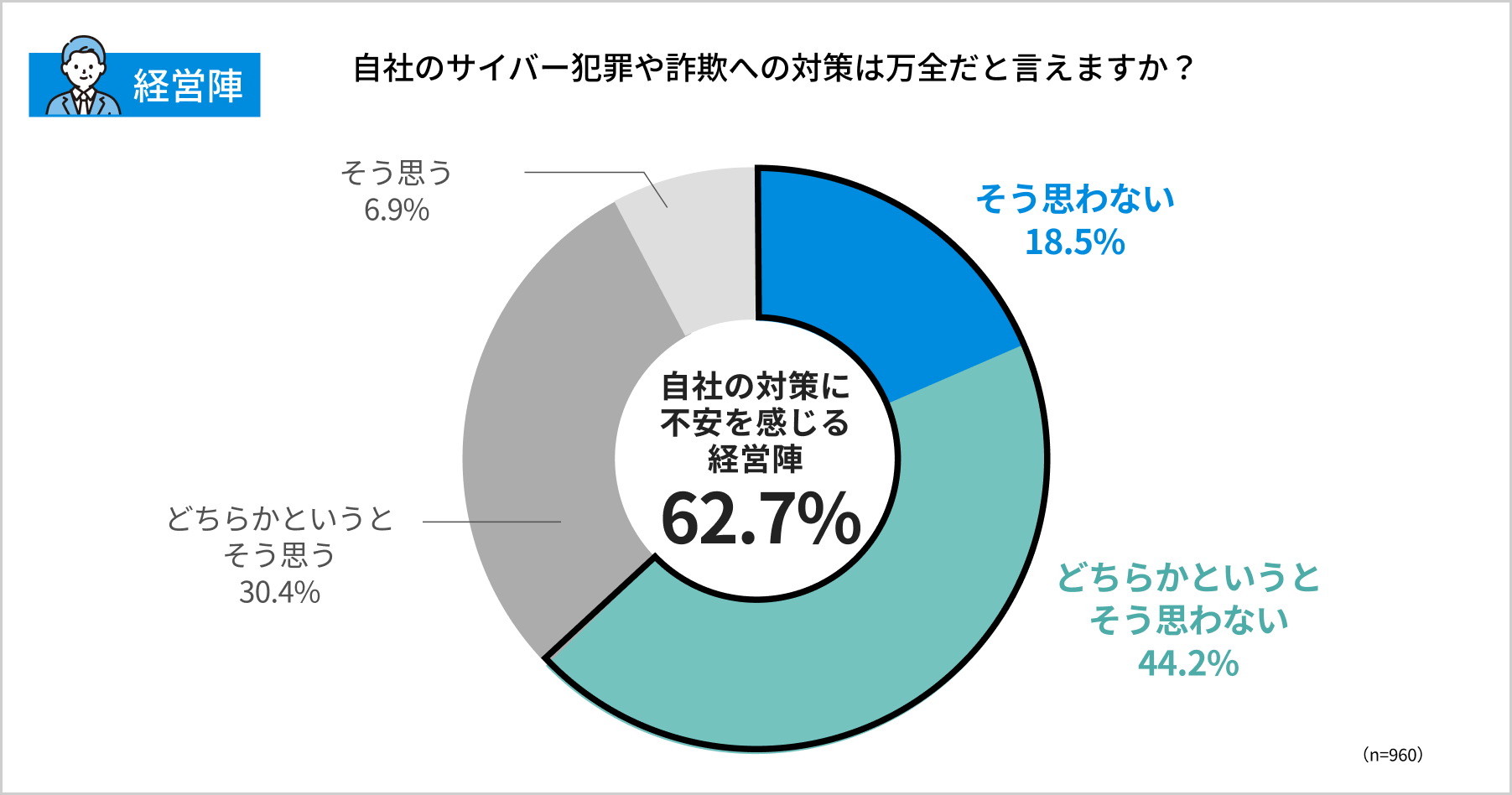 企業の経営陣に「自社のサイバー犯罪や詐欺への対策は万全だと思うか」と尋ねたところ、62.7%が「そう思わない/どちらかというとそう思わない」と回答しました。