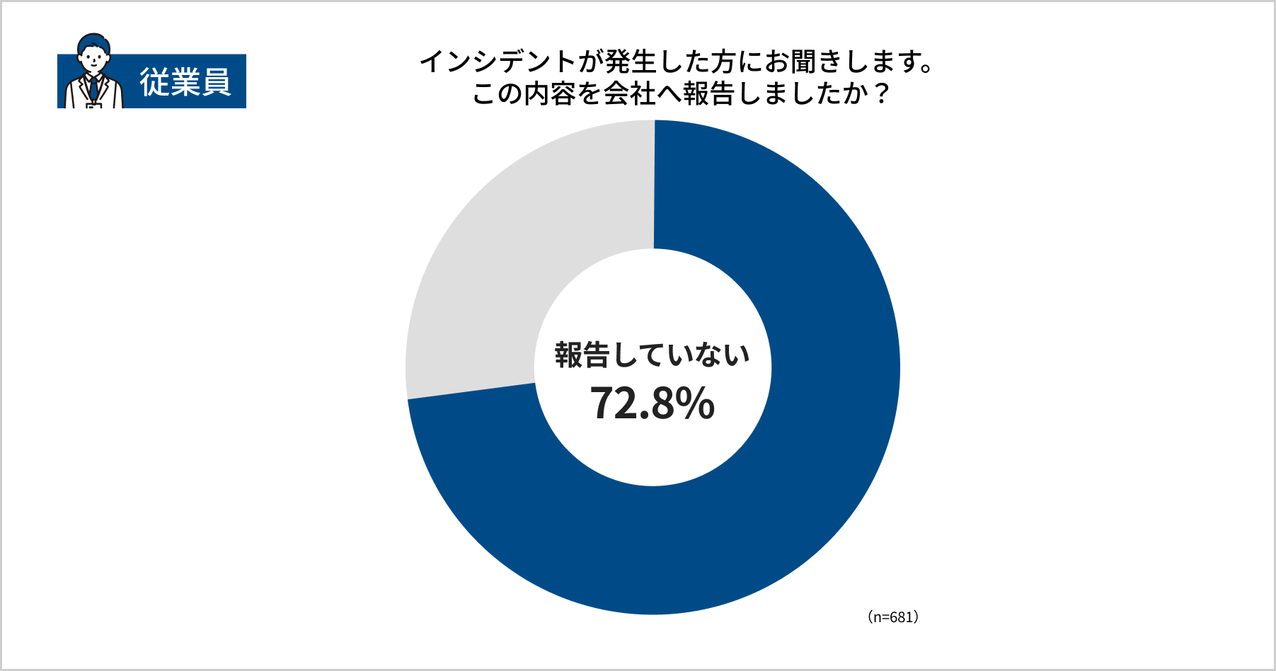 不審な電話や詐欺メール・SMSによる被害や被害未遂などのインシデントを経験した従業員に対し「この内容を会社へ報告しましたか」と尋ねたところ、72.8%が「報告していない」と回答しました。
