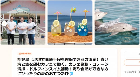 「お手伝い(短期アルバイト)」と「旅」を組み合わせた人材マッチングサービスです。人手不足に悩む地域事業者と、働きながら旅を楽しみたい旅行者をマッチングしています。