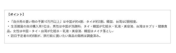 結果、生活雑貨については、大半の人が訪日前に下調べをして決める傾向があることがわかりました。一方、食品・嗜好品、耐久財についても、大半の人は訪日前に下調べをして決める傾向があるものの、生活雑貨と比較すると、訪日中に調べながら決める人も一定存在します。総じて、訪日予定者の多くが事前に調べてきているため、商品を購入してもらうためには、訪日前に銘柄を認知してもらえるようなアプローチが極めて重要であると考えます。