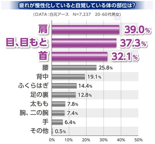 今回、当社が独自に調査したところ、肩、目、首は男女問わず多くの方が疲れの慢性化を自覚していることが分かりました(下図参照)。そこで、本体形状を再検討し、『リラックスゆたぽん 首・肩ホット ほぐれる温蒸気』は、首や肩をよりしっかり温められる形状に改良し、背中上部まで温められるようになりました。また、『同 目もとホット ほぐれる温蒸気/同 大きめサイズ』は、中身がより目もとに集まる形状に改良し、持続時間を5分から10分に延ばしました。使用回数はいずれも365回で、毎日くり返しご使用いただけます。なお、本体カラーはジェンダーレスなベージュ系を採用し、どなたでも使いやすく仕上げました。