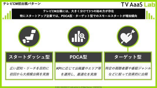 テレビCM出稿には、大きく分けて3つの始め方が存在。初回から大規模な出稿を行う「スタートダッシュ型」、エリアや出稿量を運用して最適化する「PDCA型」、そして視聴者層や番組ジャンルを絞って出稿する「ターゲット型」に分類される。今回の分析では、テレビCM初出稿広告主全体での出稿量と、一社あたりの平均出稿量の減少が見られ、スモールスタート化の傾向を確認できた。特に、スタートアップ企業では6割以上の企業が小規模出稿していることも明らかとなりPDCA型やターゲット型での出稿が増加していることも推察できる。