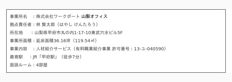 これまで、若年層や外国籍などそれぞれ求職者様の特徴に合わせた転職・採用支援に努めてまいりました。今回、山梨オフィスの開設を機に、山梨県にお住まいの求職者様・企業様の専任担当として、地域に根ざしたサービスをご提供していく所存です。山梨県には製造業を筆頭に、あらゆる業種において採用需要のある企業様、およびキャリアアップ・キャリアチェンジを希望されている求職者様がいらっしゃるにもかかわらず、直接相談できるような転職エージェントは多くはない状況でした。オンラインなどデジタル化が進んでいる昨今ですが、キャリアという重大な事項だからこそ、直接お会いしてお話をお伺いする所存です。求職者様、企業様から直接ニーズを汲み取ったうえで、転職市場やノウハウなど充実した情報をご提供し、転職・採用活動の成功まで一気通貫でご支援いたします。また、当社では業種・職種に特化した専門性の高いサービスを強みのひとつとしております。20年間人材紹介専業で積み上げてきた経験を最大限に生かし、精度の高いマッチングを行い、山梨県内の雇用機会の最大化に努め、山梨県を代表するような転職エージェントを目指してまいります。転職にお困りの方・採用にお困りの企業様がいらっしゃいましたら、まずはご相談からお声がけいただけますと幸甚です。
