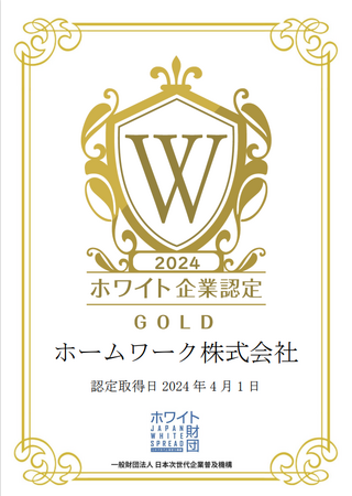 ホームワーク株式会社が、一般財団法人日本次世代企業普及機構(通称:ホワイト財団)が運営する「ホワイト企業認定 ゴールドランク」を取得したことをお知らせいたします。