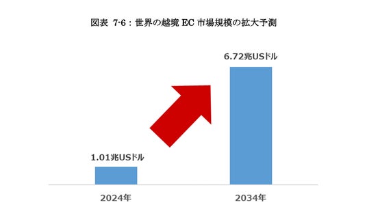 経済産業省の調査では、2024年の世界の越境EC市場規模は2034年には6.72兆USドルにまで拡大すると予測されています。2025年から2034年の年平均成長率は約23.1%と推計されており、越境ECの市場規模は拡大し続けていくと見られています。