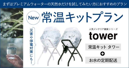 本プランは、ウォーターサーバーを利用せずに、プレミアムウォーターの天然水をお水代のみで利用できるプランです。人気インテリア雑貨メーカー「山崎実業」が手がけた「常温キット tower(タワー)」を無料で利用でき、「プレミアムウォーターの天然水:1セット(12L×2本)」を、4,752円(税込)で定期配送※いたします。ウォーターサーバーを利用せず、より手軽にプレミアムウォーターの天然水を楽しみたい方におすすめです。※1セット(12L×2本)でお届け。また適宜追加注文も可能。