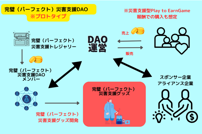 企業とアライアンスを組んで、「完璧(パーフェクト)災害支援DAO」から災害支援グッズを販売する予定です。
