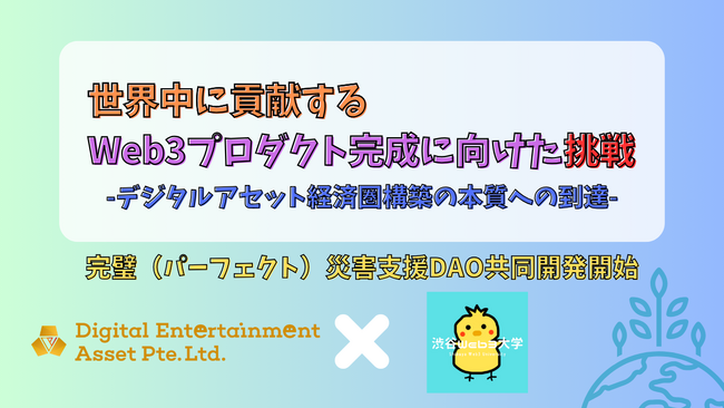 シンガポールを拠点にグローバルでGameFiプラットフォーム事業を展開するDigital Entertainment Asset Pte. Ltd. (以下、DEA)は、渋谷Web3大学を運営するシマウマ合同会社(本社:東京都渋谷区、社長兼CEO:北村元、以下、シマウマ )と災害支援に貢献するWeb3プロダクトの共同開発を開始いたしました。第1弾は「完璧(パーフェクト)災害支援DAO」です。