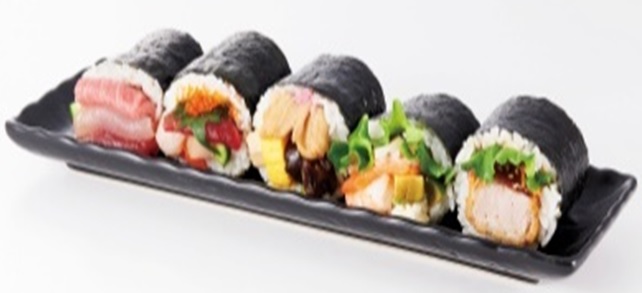 「めばちまぐろ赤身」、「サーモン」、「帆立」、「えび」等の人気具材に加え、食感が楽しめる「数の子バラ子」や「きゅうり」、「大葉」を盛り込んだ、王道の海鮮太巻です。具材のカットサイズや鮮度にこだわった当社オリジナルの海鮮芯を使用し、7種類の具材をバランス良く盛り込みました。1本食べても飽きのこない様にしています。