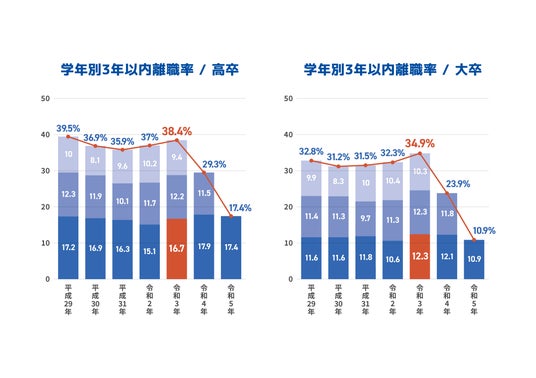 高卒者と大卒者での3年以内の離職率は、4ポイントほど差がありますが、両者の1年目の離職率の差は4.4ポイントと、もっとも大きく、2年目3年目は同じか高卒が低い現状です。