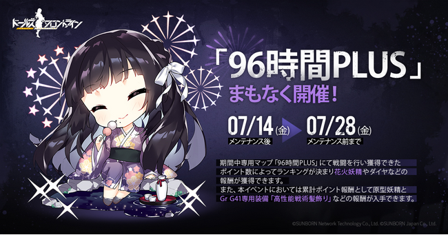 株式会社サンボーンジャパンは、スマホ向け戦略型シミュレーションゲーム『ドールズフロントライン(以下、「ドルフロ」)』において、「7月14日(金)メンテナンス後」より専用マップでポイントを競うランキング戦「96時間PLUS」を開催することをお知らせいたします。