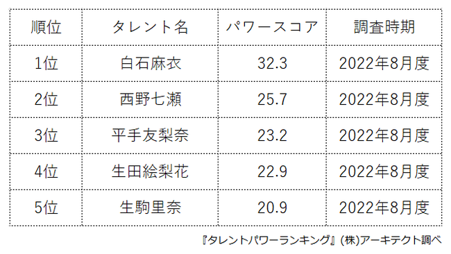 本ランキングは、2022年8月度に実施したタレント調査データ(一部過去実施データ)を利用し、タイトルに応じてランキング形式でまとめたものです。