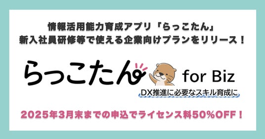 自治体向けサービスを開発する株式会社ミラボ(本社:東京都千代田区、代表取締役:谷川一也、以下「ミラボ」)と、情報モラル教育・プログラミング教育を手がける株式会社教育ネット(本社:神奈川県横浜市、代表取締役:大笹いづみ、以下「教育ネット」)は、共同開発したWEBアプリケーション「らっこたん」を、企業の様々な課題に合わせてカスタマイズしたサービス「らっこたん for Biz」スキルアッププランをリリースしました。