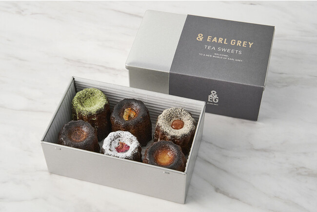 他にも焦がし塩キャラメルをトッピングした「ほうじ茶カヌレ」やローズの花びらをトッピングした「ジャスミン茶カヌレ」、オレンジピールをトッピングしたスパイス香る「チャイカヌレ」など、全6種類をスタイリッシュな缶に入れてお届けします。