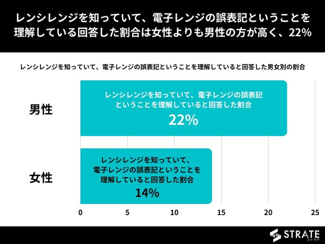 レンシレンジを知っていて、電子レンジの誤表記ということを理解していると回答した割合を性別でみてみますと、男性が22%、女性が14%という結果になりました。