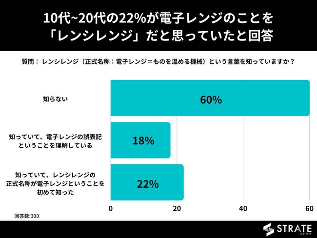 10代~20代の男女を対象とした「レンシレンジ(正式名称:電子レンジ=ものを温める機械)という言葉を知っていますか?」というアンケートで最も多かった回答は「知らない」で60%でした。