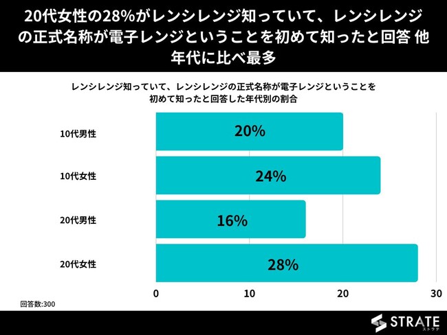 知っていて、レンシレンジの正式名称が電子レンジということを初めて知ったと回答した割合を年代別でみてみますと、10代男性が20%、10代女性が24%、20代男性が16%、20代女性が28%という結果になりました。