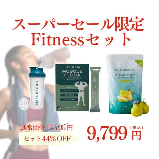 お腹が緩くならないクリアホエイプロテインと胃腸の調子を整えるフローラサプリメントが期間限定のセットになって登場。