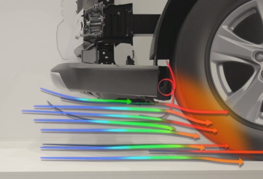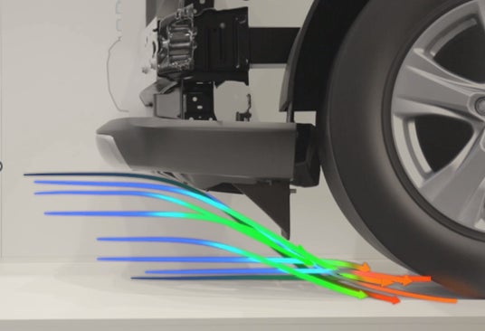 従来のフロントスパッツは車両に固定されており、路面との干渉を避けるために高さを確保する必要があったため、空気抵抗低減に限界がありました。今回新たに開発、採用された「可動式フロントスパッツ」は走行速度に応じて自動で格納・展開します。停車時や低速走行時には格納することで走破性を確保し、高速走行時には独自のリンク構造によって展開することでタイヤにかかる空気の整流効果を最大化し燃費の向上、航続距離の延長に貢献しています。