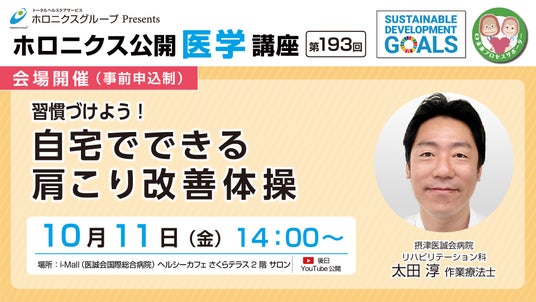 医療法人医誠会(大阪府大阪市 代表者:谷 幸治)では、第193回ホロニクス公開医学講座 『習慣づけよう!自宅でできる肩こり改善体操』を大阪市北区南扇町にあるi-Mall内ヘルシーカフェ「さくらテラス 2階サロン」にて2024年10月11日(金)に開催いたします。
